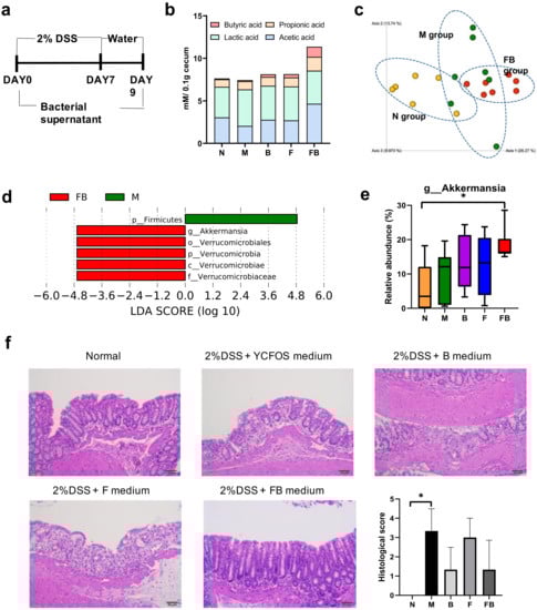 DSS-induced colitis is a commonly used model in IBD research. To evaluate the anti-inflammatory effect of the FB bacterial culture supernatant on DSS-induced colitis, we established DSS-induced colitis in mice (Figure 6a). The mice were fed ad libitum 2% (w/v) DSS in drinking water for 7 d, followed by normal tap water for 2 d; they were concomitantly fed the bacterial supernatant. At the end of the experiment, we determined the levels of four major SCFAs (acetate, propionate, lactate, and butyrate) in the cecum (Figure 6b). The cecum of mice fed the FB supernatant contained significantly more butyrate than the cecum of the n and M groups (p < 0.05). Further, the cecum of mice in the FB group contained significantly more acetate and propionate than the cecum in the M group. The Bray-Curtis distance analysis revealed distinct differences in the beta-diversity between the M, n, and FB groups (Figure 6c). We also used LEfSe to identify the dominant colonic microbiota in the M and FB groups. Pairwise comparison revealed an increased abundance of Akkermensia and Verrucomicrobiales in the FB group compared with the M group (Figure 6d). Further, feeding FB supernatant significantly increased the relative abundance of Akkermansia compared with the n group (p < 0.05; Figure 6e). Finally, as determined by H&E staining, feeding 2% DSS resulted in widely distributed intestinal epithelial damage, inflammatory cell infiltration, and edema in the colon (Figure 6f). In contrast, the intestinal epithelium in the FB group was relatively intact.