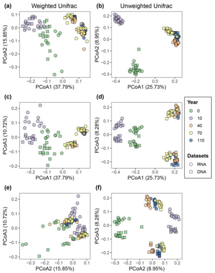β-diversity patterns of bacterial communities displaying differences according to soil successional stages and sequencing approach (i.e., DNA- or RNA-based). Weighted (a,c,e) and unweighted (b,d,f) UniFrac distances were used to calculate β-diversity, which was visualized using principal coordinate analysis (PCoA). PCoA results are illustrated in different ordinate axes. Colors represent successional stages (i.e., 0, 10, 40, 70 and 110 years of succession), and different shapes represent RNA- and DNA-based approaches. The percentages in the axes show the variation of species composition explained by each ordinate.
