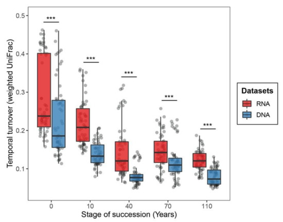 Boxplots displaying the temporal variation of RNA- and DNA-inferred communities along the soil successional stages. The temporal variation was based on weighted UniFrac distances of communities across distinct sampling time points. *** indicates p < 0.001 in Wilcoxon signed-rank test.