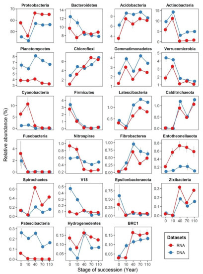We identified the dominant phyla (>3% of total abundance) in both DNA and RNA datasets to be Proteobacteria, Bacteroidetes, Actinobacteria, Acidobacteria and Planctomycetes (Figure 4). As ecological succession proceeds, the relative abundance of most bacterial phyla change in a similar manner in both DNA- and RNA-based samples. For instance, the relative abundance of Firmicutes were nearly identical in both datasets across all successional stages. However, even though most of the dominate phyla changed their relative abundances in a similar manner, their relative abundances in DNA- and RNA-based samples were different. Some phyla had higher relative abundances in the DNA dataset, such as Acidobacteria, Actinobacteria, Planctomycetes, Gemmatimonadetes and Verrucomicrobia, while others such as Proteobacteria and Entotheonellaeota had higher relative abundances in the RNA dataset. Besides, we also found different phyla distribution patterns across successional stages between DNA- and RNA-based samples. For example, Cyanobacteria only appeared at a higher relative abundance in the RNA-inferred communities at early successional stages, but not in the DNA-inferred communities. The relative abundance of Nitrospirae in the RNA-inferred communities decreased quickly along succession, but not in the DNA-inferred communities. The relative abundance of the candidate phylum V18 was stable in the RNA-inferred communities but declined rapidly at the DNA-inferred communities as succession proceeded.