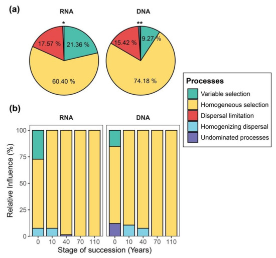 Pie charts and stacked-bar plots displaying the relative influences of assembly processes governing community turnover. (a)The pie charts show the relative influence of distinct assembly processes determining the spatiotemporal variation of RNA- and DNA-inferred communities. (b) Stacked-bar plots display the relative influences of distinct assembly processes structuring the temporal variation of bacterial communities in each successional stage based on both RNA- and DNA-based approaches. * indicates the influence of homogenizing dispersal and undominated processes for the turnover of RNA-inferred communities to be 0.62% and 0.06%, respectively. ** indicates the influence of homogenizing dispersal and undominated processes for the turnover of DNA-inferred community to be 0.68% and 0.45%, respectively.