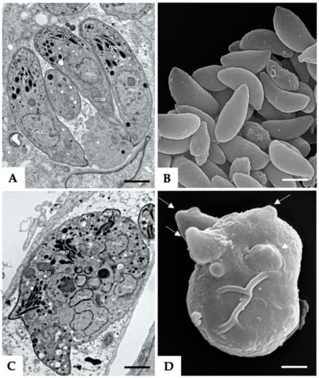 Tachyzoites (A,B) and BKI-1294 induced MNCs (C,D). (A,C) are TEM micrographs, with A showing individual tachyzoites situated within a parasitophorous vacuole, and © an MNC with multiple nuclei (nuc). Also visible are mitochondria (mito), rhoptries (rop), and apical complexes protruding from the MNC (black arrows). (B,D) are SEM micrographs of isolated tachyzoites and an MNC, respectively. Note the multiple apical complexes protruding from the surface of the MNC indicated by white arrows. Bar in (A) = 1 µm; bars in (B–D) = 1.2 µm.