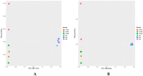 Principal component analysis of proteome data sets from N. caninum tachyzoites and from MNCs induced by BKI-1294 treatment. Tachyzoites and MNCs were grown, purified and subjected to MS shotgun analysis as described in the Materials and Methods. All technical and biological replicates are shown, namely red square, brown circle, and green triangle for tachyzoites (CTR), and pink circle, blue square, and turquoise diamond for MNCs (M). (A) iTop3 data; (B) iLFQ data.