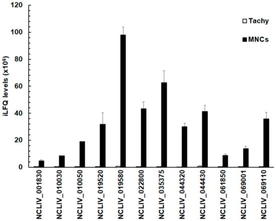 The relative abundance of these 12 proteins given by their respective iLFQ intensities—negligible in tachyzoites—reached up to 108 iLFQ units in MNCs in the case of the SRS-domain containing protein NCLIV_019580, formerly annotated as SAG4 (Figure 3).