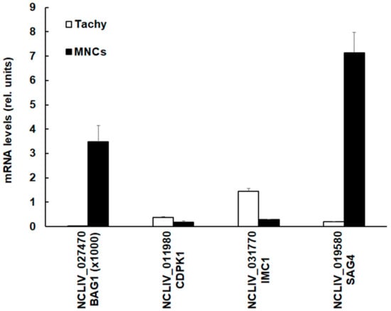 Quantitative assessments of mRNA levels of four selected genes. Confluent human foreskin fibroblast monolayers were infected with N. caninum tachyzoites and left untreated for the generation of tachyzoites (Tachy, white bars) or treated with BKI-1294 in order to generate MNCs (MNCs; black bars). Cells were harvested, mRNA was extracted, cDNA was prepared, and mRNA levels were quantified as described in Section 2.5. Mean ± standard error values from four replicates were assessed and expression levels were given as values in arbitrary units relative to the amount of 28S rRNA. The genes are termed by their respective accession numbers in ToxoDB.