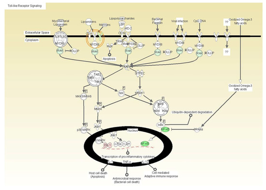 The illustration depicts the localization of the gene products by cellular compartmentalization including extracellular space, cytoplasm, and nucleus and indicates the downregulated expression of Toll-like receptor (TLR) signaling molecules as an effect of vitamin E formulation treatment on heat killed C. albicans-stimulated fibroblasts with associated p-values. All gene products highlighted in green are significantly down-regulated. The downregulated expression of Toll-like receptor (TLR) signaling molecules as an effect of vitamin E formulation treatment on heat killed C. albicans-stimulated fibroblasts with associated p-values. All gene products highlighted in green are significantly downregulated.