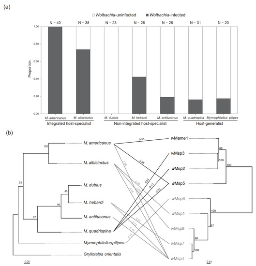 It is noteworthy that the integrated host-specialists (e.g., M. americanus and M. albicinctus) tend to harbor higher Wolbachia prevalence and diversity among three types of ant cricket species. wMsp4 persists with a high frequency only in M. americanus (Figure 1b) but not in other wMsp4-infected ant cricket species, suggesting that M. americanus is particularly prone to Wolbachia infection. While the reasoning behind high diversity and prevalence of Wolbachia in integrated host-specialists remains unclear, one hypothesis is that the degree of host dependence may interact with Wolbachia persistence within host populations due to different selection forces operating on hosts, or factors related to a lifestyle beneficial for the establishment of Wolbachia (e.g., limited dispersal [37]). Support for this observation is available in the system involving fire ants and their social parasites in which an unexpectedly high Wolbachia diversity was found in the social parasites (up to eight strains), while the free-living hosts rarely harbor more than one Wolbachia strain [17,38]. However, one could also argue that these two sister species share common traits/genetic backgrounds encouraging the Wolbachia persistence in the populations.