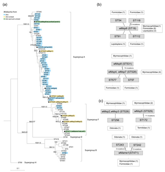 (a) Maximum Likelihood (ML) phylogeny of Wolbachia based on MLST data, with ML bootstrap values (left) and Bayesian posterior probability (right) given. Note that both Bayesian inference and ML yielded a highly similar topology. Black circles denote the Wolbachia STs identified in the present study. Wolbachia from ants, ant crickets and Wolbachia shared between ants and ant crickets are colored blue, yellow and green, respectively. Relationships among supergroup A Wolbachia and supergroup F Wolbachia strains based on MLST data are shown in (b,c), respectively. Strains that differ in a single mutation are connected with a solid line. Host information is provided in the white box with the number of host species indicated in parentheses.