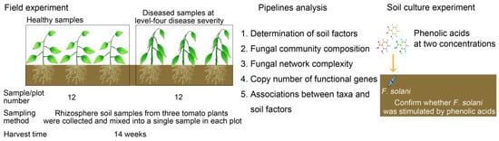 The field experiment was conducted in Qilin Town (118°57′ E, 32°03′ N), a vegetable production center in the urban area of Nanjing, China. The soils were Luvisols (FAO). The experimental field had been continuously planted with tomatoes for more than 5 years before the experiment, and tomato bacterial wilt disease occurred naturally. The experimental field was divided into 30 plots. To weaken the previous differences in the fungal community of the field soils, we randomly and widely took 72 tomato plants from 24 plots (12 plots for healthy plants and 12 plots for diseased plants). The detailed sampling method is listed as follows: At the end of the harvest (approximately 14 weeks for tomato plants, 11 October 2016), twelve plots with healthy or bacterial wilt-diseased tomato plants (level-four disease severity []) were selected to sample. Within each plot, rhizosphere soil samples from three tomato plants were collected and mixed into a single sample (Figure 1). After the plants were dug out, the roots were carefully shaken to remove the loosely adhering soil, and the remaining attached soil was carefully collected as rhizosphere soil using a sterile brush. In total, 24 rhizosphere soil samples were obtained for soil DNA extraction.