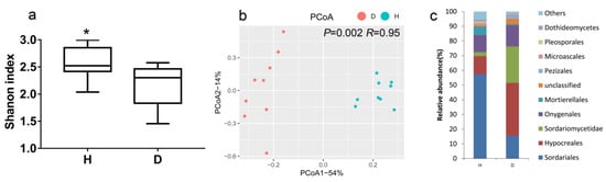 Fungal community diversity, structure and composition in healthy (H) and bacterial wilt-diseased (D) tomato plant rhizospheres. (a) Fungal community Shannon diversity of rhizosphere soils between healthy (H) and bacterial wilt-diseased (D) tomato plant rhizospheres. Statistical significance was determined based on Student’s t-test. * p < 0.05. (b) Principal coordinate analysis (PCoA) based on Bray–Curtis index dissimilarity of relative abundance data in healthy (H) and bacterial wilt-diseased (D) tomato plant rhizosphere fungal communities. (c) Relative abundance (%) of the orders in the rhizospheres of healthy (H) and bacterial wilt-diseased (D) tomato plants.