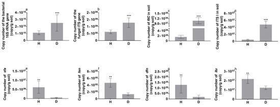 Copy number of functional genes in the rhizospheres of healthy (H) and bacterial wilt-diseased (D) tomato plants. (a) 16S rRNA, (b) ITS, (c) fliC, (d) ITS I, (e) sfr, (f) fen, (g) dfn and (h) itu represent total bacteria, total fungi, R. solanacearum, F. solani, surfactin, fengycin, difficidin and iturin, respectively. Statistical significance was determined based on Student’s t-test. *** p < 0.001, ** p < 0.01, * p < 0.05.