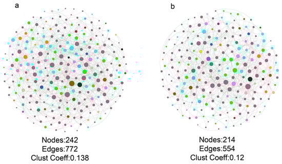 Fungal networks of healthy (a) and bacterial wilt-diseased (b) tomato plant rhizospheres. The number of nodes and edges and the clustering coefficients are shown below the networks. The node sizes represent the link numbers. Pink and blue lines represent negative and positive associations, respectively.