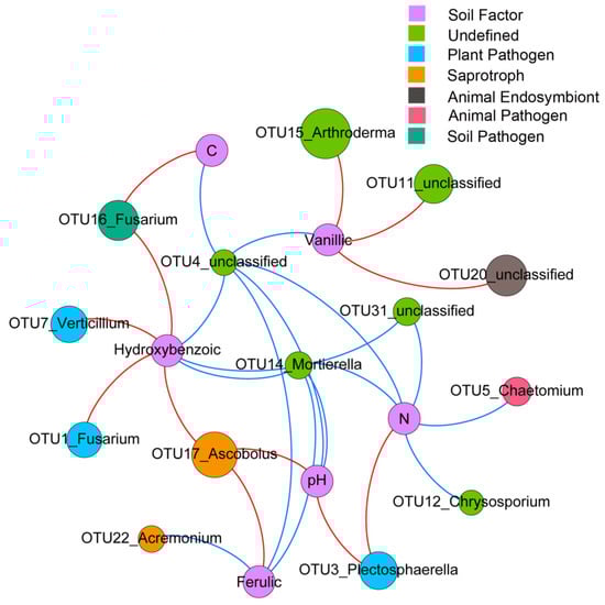 Network showing the soil factors in determining the abundance of dominant OTUs (top 20) by random forest analysis. The size of the circles represents the ratio of OTU relative abundance between diseased and healthy samples. The color of the circles represents the functional information predicted by FUNGuild. The green and red links represent the cases where soil factors negatively or positively affected the OTUs, respectively. Ferulic, vanillic and hydroxybenzoic represent ferulic acid, vanillic acid and p-hydroxybenzoic acid, respectively.