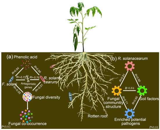 Proposed model for (a) R. solanacearum invasion, release of phenolic acids from rotten roots, decrease in antagonistic gene copy numbers, increase in F. solani abundance, decrease in fungal diversity and complexity of fungal co-occurrence; and (b) reasons for the changes in fungal community structure.