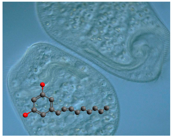 Climacostol (5-[(2Z)-non-2-en-1-yl]benzene-1,3-diol) is a toxic secondary metabolite physiologically produced by the freshwater ciliate Climacostomum virens (Figure 2) for chemical defense against unicellular and multicellular predators, or for chemical offence to assist its carnivorous feeding [3,17]. This molecule is formed by a phenolic skeleton and a long unsaturated aliphatic hydrocarbon chain attached to the ring structure, and belongs to resorcinolic lipids (or alkenylresorcinols), a group of natural amphiphilic compounds detected in both prokaryotes and eukaryotes. The 5-alkenylresorcinols usually have an isolated double bond in the chain portion of the molecule, while examples with a conjugated double bond with aromatic ring are unusual [18]. A possible pathway for the biosynthesis of climacostol was proposed from the C16-polyketide, with a cyclization and a decarboxylation [19], and the toxin was also obtained by chemical synthesis [19,20]. More recently, climacostol has been synthetized as a pure compound in the natural and most bioactive Z-configuration by a novel and straightforward synthesis [21], which has allowed researchers to better study its effects on different biological systems.