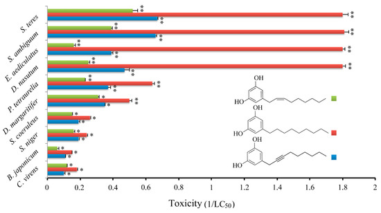 Cytotoxic effect of climacostol and its alkyl and alkynyl derivatives on ten ciliate species. Cell viability was assessed after 24 h, and each bar represents the mean (±SE) of 3 independent experiments. * p < 0.05 and ** p < 0.001. Original data from [24].