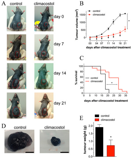 In vivo antitumor properties of climacostol in mice bearing melanoma allografts. When the B16-F10 syngeneic implantation was established, animals were intratumor injected with vehicle (control) or climacostol at 600 μg/mL every 3–4 days for 3 weeks. (A) Typical photographs taken at different time points and depicting the growth of subcutaneous melanomas, as indicated by red circles. (B) Tumor growth monitored by means of external caliper measurements and volume calculation. Arrows indicate the day of climacostol treatment. (C) Percentage survival analyzed by Kaplan–Meier curve. Images and data points in (A–C) represent the results obtained from 7–15 animals per experimental group. (D) Typical photographs of subcutaneous melanoma allografts excised from mice at day 16 of treatment (on day 0 and then every 3–4 days) with vehicle (control) or climacostol (600 μg/mL). Scale bar: 5 mm. (E) Weight of the excised tumors. Images and data in (D, E) represent the results obtained from 3 animals per experimental group. * p < 0.001 vs the respective control. Original picture from [29] and reproduced under the Creative Commons attribution 4.0 license: http://creativecommons.org/licenses/by/4.0/.