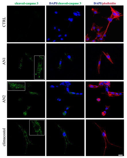 Induction of apoptosis by climacostol and its analogues (AN1, AN2) in melanoma cells. Immunofluorescence of cleaved-caspase 3 (punctate green pattern) in B16-F10 cells cultured in the presence of 30 µg/mL of AN1, AN2, and climacostol or vehicle (CTRL) for 9 h. DAPI (blue) and phalloidin (red) were used for nuclei and cytoskeleton detection, respectively. Inserts represent enlarge image details. Scale bar = 20 µm. Original picture from [31] and reproduced under the Creative Commons attribution 4.0 license: http://creativecommons.org/licenses/by/4.0/.