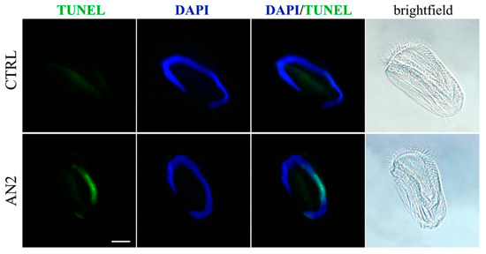 Induction of programmed cell death in ciliated protozoa Euplotes aediculatus. TUNEL assay in E. aediculatus treated with 2 µg/mL AN2 or vehicle (CTRL) for 2 h. 4′,6-diamidino-2-phenylindole (DAPI) (blue) was used for nuclei detection. Scale bar = 30 µm. Original picture from [31] and reproduced under the Creative Commons attribution 4.0 license: http://creativecommons.org/licenses/by/4.0/.