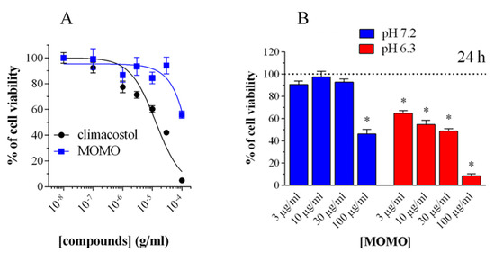 Cytotoxicity of methoxymethyl ether (MOM)-protected climacostol (MOMO) in melanoma cells. (A) 3-(4,5-dimethylthiazole-2-yl)-2,5-diphenyltetrazolium bromide (MTT) colorimetric assay on mouse B16-F10 cells, treated with increasing concentrations of MOMO and climacostol for 24 h. (B) Increasing concentrations of MOMO in physiologic (pH 7.2) and acidic (pH 6.3) culture medium for 24 h of incubation. Data are representative of at least 6 independent experiments. * p < 0.0001 relative to the respective control. Modified from [39] and reproduced under the Creative Commons attribution 4.0 license: http://creativecommons.org/licenses/by/4.0/.