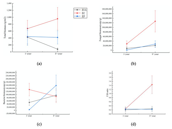 For the eucalyptus plantations with different ages, the soil fungal and bacterial biomasses, and the ratio of fungal and bacterial biomass (F:B) differed (p < 0.05, Table 1), whereas the soil total microbial biomass did not differ (Figure 1a). With the increasing plantation age, the fungal biomass increased in the EC plantation (p < 0.05, Figure 1b). The bacterial biomass significantly increased in the EUG and EP plantations, whereas it decreased by 33% in the EC plantation (p < 0.05, Figure 1c). The F:B ratio also increased in the EC plantation (p < 0.05, Figure 1d).