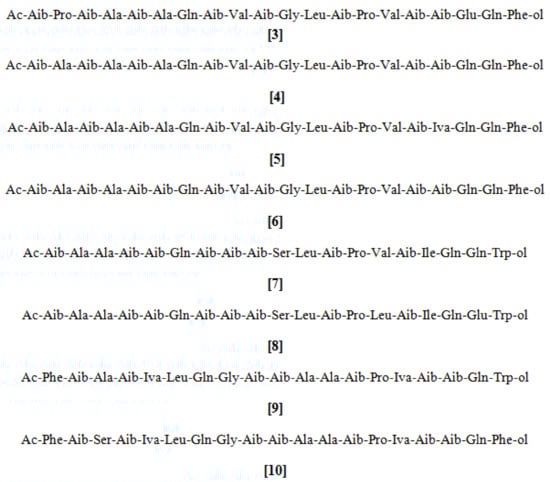 Structures of antifungal peptaibols from Trichoderma spp.: [3] alamethicin F30, [4] trichokonin VI, [5] trichokonin VII, [6] trichokonin VIII, [7] trichorzianine A1, [8] trichorzianine B1, [9] peptaivirin A, [10] peptaivirin B; peptaibols [4], [5], and [6] were isolated from T. koningii, [7], [8], [9], and [10] were isolated from T. harzianum.