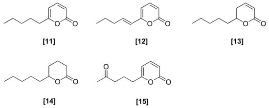 - Parker, R.S.; Cutler, H.G.; Jacyno, J.M.; Hill, R.A. Biological activity of 6-pentyl-2H-pyran-2-one and its analogs. J. Agric. Food Chem. 1997, 45, 2774–2776. [Google Scholar] [CrossRef]