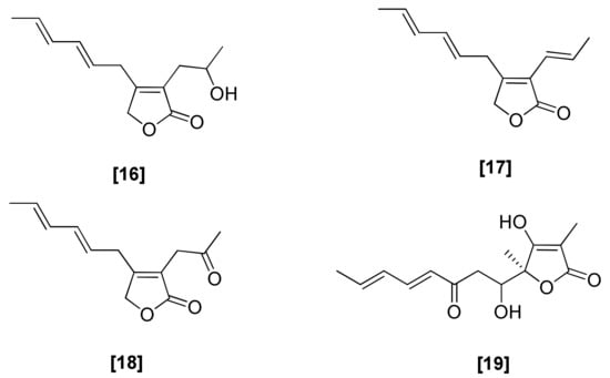 An antifungal butenolide compound, harzianolide (Figure 4; 16), was isolated from three strains of T. harzianum [68,69,70]. The dehydro-derivative (17) of harzianolide (16) was obtained from T. harzianum. Another butanolide, T39butenolide (18), was produced by a commercially available T. harzianum strain [71]. All of these compounds (16–18) showed antifungal activity against Gaeumannomyces graminis var. tritici [68,71]. Harzianolide (16) particularly inhibited the growth G. graminis var. tritici at 200 mg/mL, while T39butenolide (18) inhibited the growth of G. graminis at 100 mg/mL. Additionally, harzianolide (16) and T39butenolide (18) caused growth inhibition in P. ultimum and R. solani [71]. From the fungus T. longibrachiatum Rifai aggr, 5-Hydroxyvertinolide (19) was isolated, which was antagonistic to the fungus Mycena citricolor, the agent responsible for American leaf spot disease of coffee [72]. In another study, the antifungal effect of a compound of harzianolide (16) and T39butenolide (18) was reported against P. ultimum, R. solani, and B. cinerea [73]. The biosynthesis of these butenolides probably involves two Favorskii rearrangements from a C-14-diepoxide, resulting in the extrusion of the two carbons that form the lactone [74].