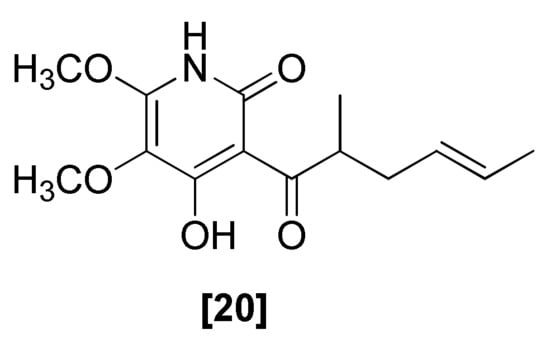 Antifungal harzianopyridone (Figure 5; 20) was first isolated from T. harzianum in 1989. It contains a pyridine ring system with a 2,3-dimethoxy-4-pyridinol pattern [75]. The racemic form of harzianopyridone (20) showed strong antifungal activity against plant pathogenic fungi, such as P. ultimum, G. graminis var. tritici [71], R. solani, and B. cinerea [75]. A laevorotatory form of harzianopyridone (20) isolated from T. harzianum exhibited weak antibacterial and antifungal activity and also showed high phytotoxicity in an etiolated wheat coleoptile bioassay analysis. The harzianopyridone (20) was also reported to cause necrosis in corn, bean, and tobacco in a concentration-dependent manner, which suggested that the two harzianopyridone (20) enantiomers may exhibit different activities [74]. In another investigation, harzianopyridone (20) isolated from T. harzianum showed activity against Phytophthora cinnamomi, B. cinerea, and Leptosphaeria maculans [73]. This compound was also reported to inhibit more than 90% of the growth of R. solani, F. oxysporum, and S. rolfsii [76]. The pyridone harzianopyridone (20) was proposed to be biosynthesized from a tetraketide with the possible involvement of aspartic acid [74,75].