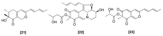 The azaphilones contain a chiral quaternary center and extremely high oxygenated bicyclic core, and hence form a structurally diverse group of SMs. Two azaphilone-type compounds, harziphilone (Figure 6; 21) and fleephilone (Figure 6; 22), were reported to be produced by T. harzianum. These were isolated by the bioassay-guided fractionation of the butanol–methanol extract of the fermentation broth of T. harzianum. T. harzianum was also found to produce another azaphilone, T22azaphilone (23). These compounds exhibited significant antifungal activity against P. ultimum, G. graminis var. tritici, and R. solani [71]. T22azaphilone (23) also exhibited antifungal activity against B. cinerea, P. cinnamomi, and L. maculans at low doses [73]. Gene deletions and biochemical investigations demonstrated that azaphilones were collaboratively synthesized by two separate clusters containing four core enzymes, two nonreducing PKSs, one highly reducing PKS, and one NRPS-like PKS. This is a meaningful mechanism of fungal SMs, which allows fungi to synthesize more complex compounds and gain new physiological functions [77].