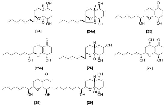 Structures of antifungal koninginins from Trichoderma spp.: [24] koninginin A, [25] koninginin B, [26] koninginin C, [27] koninginin D, [28] koninginin E, [29] koninginin G; koninginins [A], [B], [C], [D], and [E] were produced by T. koningii and koninginin [E] was produced by T. aureoviride.