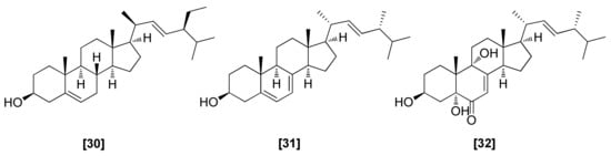 Stigmasterol (Figure 8; 30) was obtained from T. harzianum and T. koningii that showed antifungal activities against R. solani, S. rolfsii, M. phaseolina, and F. oxysporum [76,90]. Two other steroids, ergosterol (31) and 3,5,9-trihydroxyergosta-7,22-dien-6-one (32), isolated from Trichoderma sp. YM 311505, exhibited strong antifungal activities against Pyricularia oryzae, C. albicans, Aspergillus niger, and Alternaria alternata with an MIC value of 32 µg/mL [91].