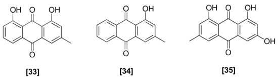 Structures of antifungal anthraquinones from Trichoderma spp.: [33] 1,8-dihydroxy-3-methylanthraquinone, [34] 1-hydroxy-3-methylanthraquinone, [35] 6-methyl-1,3,8-trihydroxyanthraquinone.