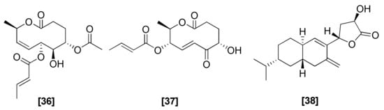 The antifungal 10-member lactone cremenolide (Figure 10; 36) was isolated from T. cremeum. Along with the promotion of tomato seedling growth, this compound (36) also showed antifungal activities against R. solani, B. cinerea, and F. oxysporum [93]. Another lactone, aspinolide C (37), was isolated from T. arundinaceum and showed an antibiotic effect against B. cinerea and Fusarium sporotrichioides. Beside its direct antibiotic effect, compound (37) also played an important role in the induction of plant resistance against phytopathogenic fungi. [94]. Cerinolactone (38) was isolated from culture filtrates of T. cerinum [95] and showed strong activity against Rosellinia necatrix [96].