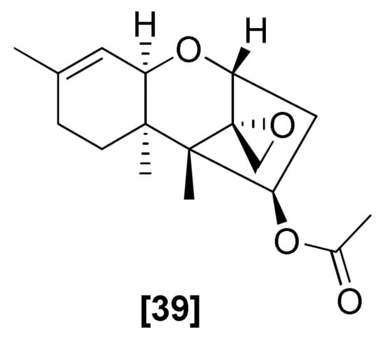 Trichothecenes are the sesquiterpenoid-derived SMs mainly produced by Fusarium and other fungal genera, like Trichoderma, Trichothecium, and Stachybotrys [97,98]. The chemical structure of trichothecenes comprises a trichothecene ring, which contains an olefinic ring at C-9,10, and an epoxide group of C-12 [97]. Trichothecenes inhibit protein synthesis by preventing peptide bond formation at the peptidyl transferase center of the 60S ribosomal subunit [99,100]. Trichodermin (Figure 11; 39) was the most widely studied antifungal compound [99,100]. It was first obtained from T. brevicompactum and displayed significant inhibitory activity on R. solani, B. cinerea, and Colletotrichum lindemuthianum (EC50 = 25.60 g/mL) [97]. It was also isolated from T. harzianum and showed activities against several phytopathogenic fungi, such as Cochliobolus miyabeanus, R. solani, C. lindemuthianum, F. oxysporum, Thanatephorus cucumeris, Colletotrichum gloeosporioides, and B. cinerea [101,102].