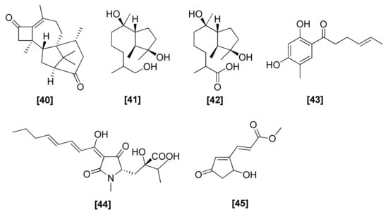 Structures of other antifungal compounds from Trichoderma spp.: [40] harziandione, [41] 10,11-dihydrocyclonerotriol, [42] catenioblin C, [43] sohirnone A, [44] harzianic acid, [45] trichodermester A.