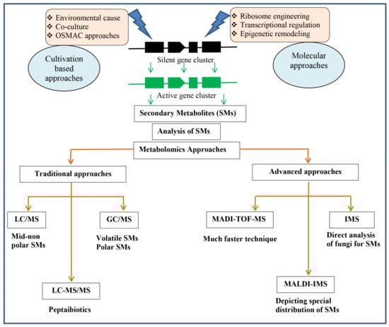 For SMs, there is not a one-to-one relationship between a metabolite and a gene. The secondary metabolome, however, in many cases is a result of many genes and their enzymes [119]. The fungal sequencing of fungal genomes disclosed the fact that gene clusters associated with SMs exceed the number of SMs from a given fungus and several gene clusters from the prediction remain silent [120]. Different molecular, as well as cultivation-based, approaches involved in the regulation of these silent gene clusters can be utilized for their activation [121,122]. Metabolomics, along with the efforts for the activation of silent gene clusters, can contribute to the development and identification of new SMs (Figure 13). Metabolomics includes the untargeted, as well as targeted, approaches for determining the identity of all low molecular weight SMs of an organism. Untargeted approaches are the methods and techniques for the searching of all known and unknown detectable compounds, while targeted approaches are for the identification of already known compounds. Different chromatographic techniques, such as gas and liquid chromatography, along with mass spectrometry, are useful for the analysis of metabolites in complex samples. These techniques are helpful to detect a large number of metabolites. The applications of liquid chromatography mass spectrometry (LC-MS) allows for the detection of mid- to nonpolar metabolites, while gas chromatography mass spectrometry (GC-MS) is suitable for the study of both volatile and polar small substances [123]. Liquid chromatography, when combined with tandem mass spectrometry (LC-MS/MS), is useful for peptaibiotic detection in the samples extracted from fungal cultures, whereby the specific amino acid, Aib, for peptaibiotics can be indicated by mass differences of D m/z 85 [30]. The known structures of peptaibiotics can be obtained by comparing the amino acid sequences obtained from LC-MS/MS analysis with their respective databases, such as the “Comprehensive Peptaibiotics Database” [124]. The matrix-assisted laser desorption/ionization time of flight mass spectrometry (MALDI-TOF-MS) is an advanced approach, which is much faster and more effective than the traditional bioactive screening techniques, to discover new bioactive SMs in fungus. This technique was used for the detection of peptaibol production profiles from 28 different Trichoderma species [125]. Imaging mass spectrometry (IMS) is another advancement that allows the direct analysis of fungi for SMs. In association with MALDI and coupled to a mass spectrometer, IMS produces images depicting the spatial distribution of natural products [126,127,128,129]. MALDI-IMS has been used for the metabolic analysis of living bacterial communities and interkingdom interactions between fungi and bacteria directly from their cultures [130,131,132]. Recently, MALDI-IMS was used to visualize the SMs in the mycoparasitic interaction of R. solani and T. atroviride [133]. Little, or even no, sample preparation requirements make the MALDI techniques well suited to the analysis of co-cultivations [134].