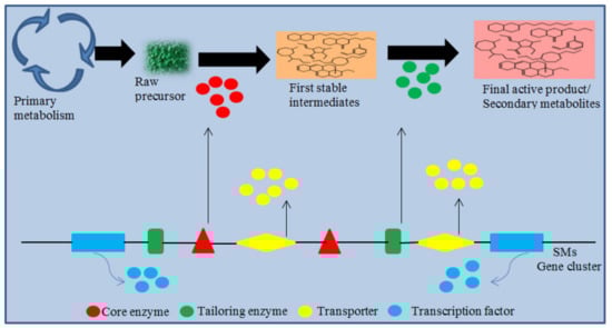 SMs are usually synthesized from a few precursors produced by primary metabolism, which act as raw material for the production of SMs. These precursors are then transformed to first stable intermediates through the action of different core enzymes. Based on the core enzyme involved in the biosynthesis of intermediates, they can be divided into different groups, such as dimethylallyl tryptophan synthases, polyketide synthases (PKSs), terpene cyclases, non-ribosomal peptide synthetases (NRPSs), and hybrid PKS-NRPS enzymes, and are involved in the production of indole alkaloids, polyketides, terpenes, non-ribosomal peptides, and PKS-NRPS hybrids, respectively [135]. The further modification of the first stable intermediates is generally accomplished by decorating or tailoring enzymes, resulting in the formation of a final active product or compound [135]. In addition to these core enzymes, the gene cluster of SMs may also contain other genes that encode transcription factors for the regulation of gene expression involved in biosynthesis and transporters that contribute to self-protection or SM efflux [135,136,137,138]. The evolutionary force responsible for the maintenance and formation of SM genes in physical clustering is unclear [139]. However, the physically linked genes in a cluster exhibit the ability of better co-regulation, which allows a strong coordinated connection among the enzymes involved in the same biosynthesis pathway [140,141,142]. Here, a brief introduction on the SM biosynthetic scheme and their regulation factors in Trichoderma fungi is presented (Figure 14).