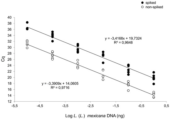 qPCR-ama curves constructed with serial dilutions of L. (L.) mexicana MHOM/MX/2011/Lacandona DNA. The curves were obtained with serial dilutions ranging from 1.0 to 1.0 × 10−5 ng/tube, spiked with 30 ng human DNA (upper curve, y = −3.4168x + 19.73; R2 = 0.9648) or nonspiked (lower curve, y = −3.3909x + 14.0605; R2 = 0.9716). Results were from three independent experiments in duplicate.