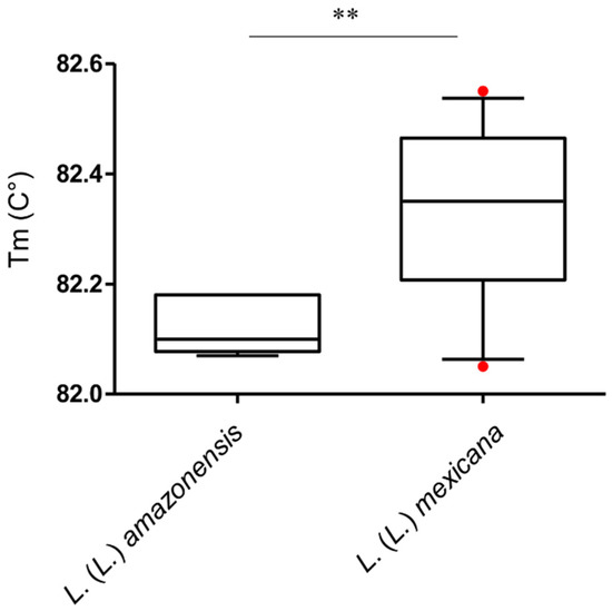Box and whisker plot with 5–95% confidence interval showing Tm values distribution obtained with high-resolution melt (HRM) analysis of qPCR-ama amplicons of L. (L.) mexicana (n = 32) and L. (L.) amazonensis (n = 6). Line within the box represents the median and the red dots above and below the whiskers represent the outliers that are either greater than 95th or less than 5th percentile. ** p < 0.01.
