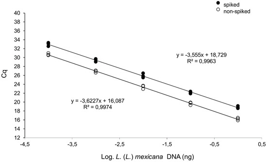 qPCR-ITS1 curves constructed with serial dilutions of L. (L.) mexicana MHOM/MX/2011/Lacandona DNA. The curves were obtained with serial dilutions ranging from 1.0 to 1.0 × 10−4 ng/tube, spiked with 30 ng human DNA (upper curve, y = −3.555x + 18.729; R2 = 0.996) or nonspiked (lower curve, y = −3.623x + 16.087; R2 = 0.997). Triplicates of the PCR amplification are represented.
