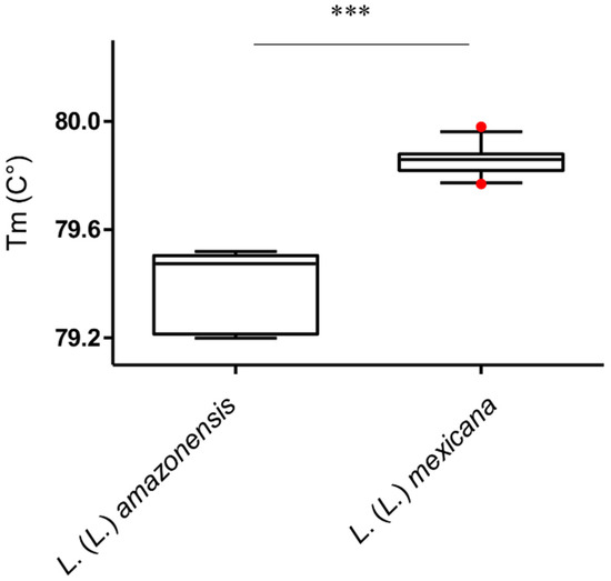 Box and whisker plot with 5–95% confidence interval showing Tm value distribution obtained with HRM analysis of qPCR-ITS1 amplicons of L. (L.) mexicana (n = 26) and L. (L.) amazonensis (n = 6). Line within the box represents the median and the red dots above and below the whiskers represent the outliers that are either greater than 95th or less than 5th percentile. *** p < 0.001.