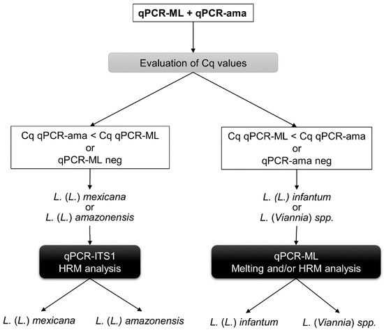 Updated sequential qPCR and HRM approach targeting minicircle kDNA and ITS1 sequence for the identification of L. (L.) infantum, L. (L.) amazonensis, L. (L.) mexicana and Viannia subgenus. First, the qPCR-ML and qPCR-ama followed by HRM analysis are performed. The evaluation of Cq values and HRM profiles for both assays will allow discriminating among L. (Viannia) spp., L. (L.) infantum and the two species L. (L.) mexicana/amazonensis. Then, qPCR-ITS1 HRM analysis is performed to discriminate between L. (L.) amazonensis and L. (L.) mexicana.