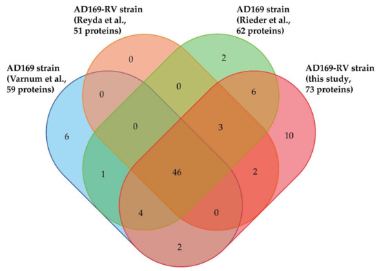 - Reyda, S.; Büscher, N.; Tenzer, S.; Plachter, B. Proteomic analyses of human cytomegalovirus strain AD169 derivatives reveal highly conserved patterns of viral and cellular proteins in infected fibroblasts. Viruses 2014, 6, 172–188. [Google Scholar] [CrossRef]