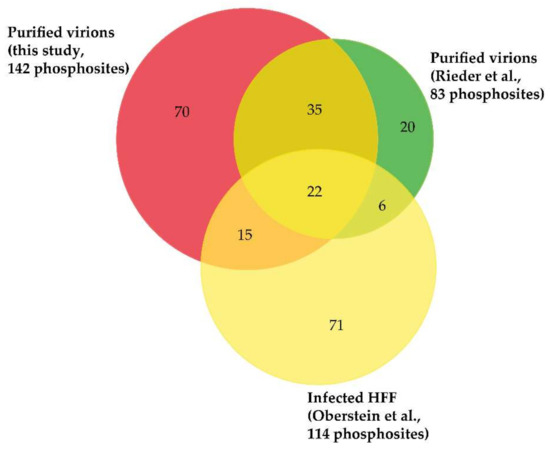 Venn diagram displaying overlap of phosphosites identified on viral proteins in HCMV virions (Rieder et al. [23] and this study) and in infected cells (Oberstein et al. [25]). Importantly, only phosphosites identified with localization probabilities above 75% were taken into account.