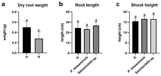 Plant growth parameters in greenhouse trial 1. (a) negative effect of M. enterolobii on dry root weight, (b) P. taiwanensis and Samsoniella sp. strain NTUCC 18–159 effects on root length, and (c) shoot height. H is the healthy control. N is the nematode-only treatment. Different letters indicate significant differences among treatments by Fisher’s LSD test (P < 0.05), respectively.