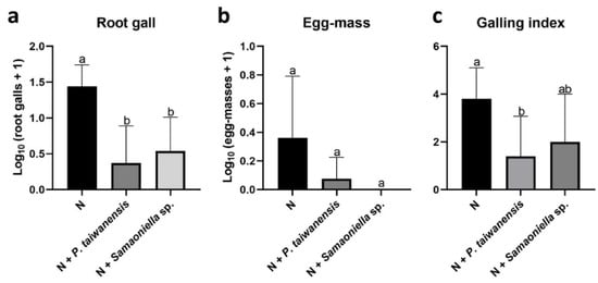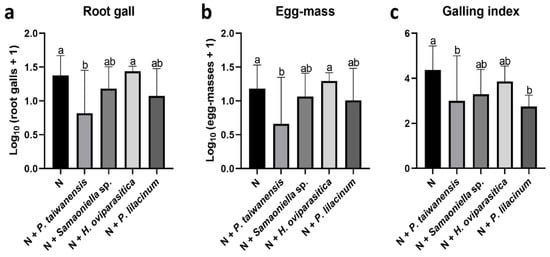 Effects of P. taiwanensis, Samsoniella sp. strain NTUCC 18–159, H. oviparasitica, and P. lilacinum strain 251 (PL251) on M. enterolobii in greenhouse trial 1. (a) root gall, (b) egg mass, (c) root galling index. N is the nematode-only treatment. Different letters indicate significant differences among treatments by Fisher’s LSD test (P < 0.05), respectively.