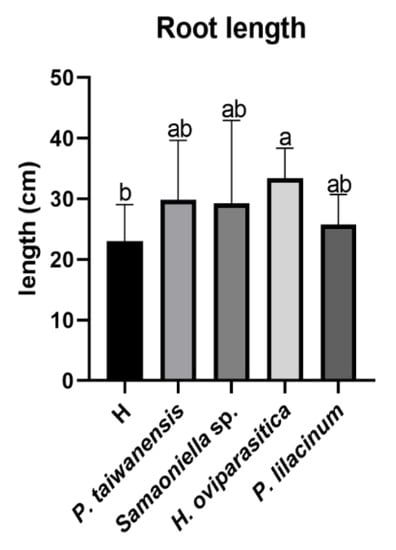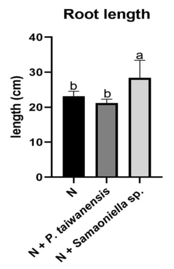 Root length promotion effect in greenhouse trial 1. N is the nematode-only treatment. Different letters indicate significant differences among treatments by Fisher’s LSD test (P < 0.05), respectively.