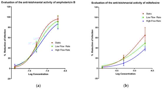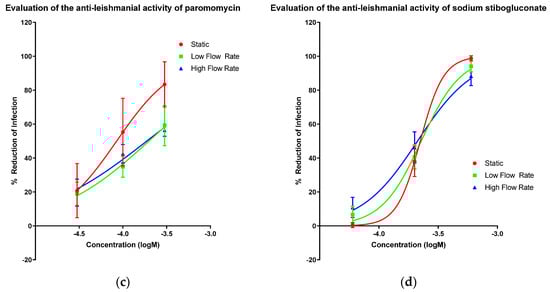 Dose-response curves showing the reduction in infection of mouse peritoneal macrophages (PEMs) caused by amphotericin B (a), miltefosine (b), paromomycin (c) and sodium stibogluconate (d) with a variable slope and minimum and maximum set to 0 and 100% respectively. Infection was measured by manual counting using a microscope and the drug-induced percentage reduction of infection was calculated in comparison to untreated controls. Three different experimental conditions resulting in three different media perfusion speeds were used: static (0 m/s), low flow (1.45 × 10−9 m/s) and high flow (1.23 × 10−7 m/s). n = 9. Error bars show SD.