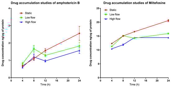 Accumulation of amphotericin B (AmB) increased over time (Figure 2) (Table 3 and Table 4), with the highest concentration of AmB within PEMs maintained in the static system seen after 24 h. Comparing this value, a reduced accumulation under low culture media flow (p < 0.001, two-way ANOVA) can be observed and a further reduction in accumulation under high culture media flow conditions (two-way ANOVA, p < 0.0001) is also seen. The intracellular concentrations of miltefosine also increased over time (Figure 2). By 24 h, the static system showed the highest accumulation of drug compared to the low flow media assay (p < 0.01, two-way ANOVA), and the high media flow assay (p < 0.001, two-way ANOVA). Both data sets show that, the cells maintained under flow conditions have reduced drug accumulation compared to the static culture I.e., higher the flow speed of the media over the surface of the cells, the lower the drug accumulation.